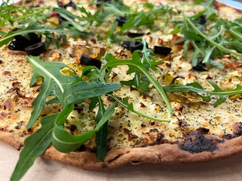 Flammkuchen "Griechischer Art" mit Peperoni und Hirtenkäse